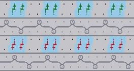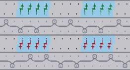 在外侧编织的织针彼此相对,这样,织针之间有两枚针空出来。 这些织针需要将线圈转移到内侧 (间隔)。