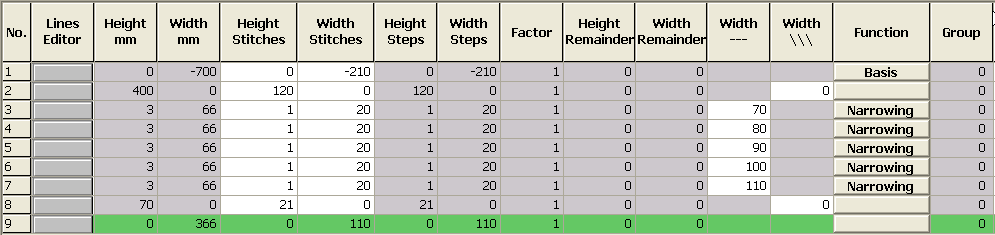 Define a higher stepping as the narrowing width (step 20) for the edge line under Binding-off from step.
