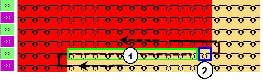 Am Ende des gekürzten Farbfeldes wird der Fadenführer über 1 Nadel bewegt (= Flottung)